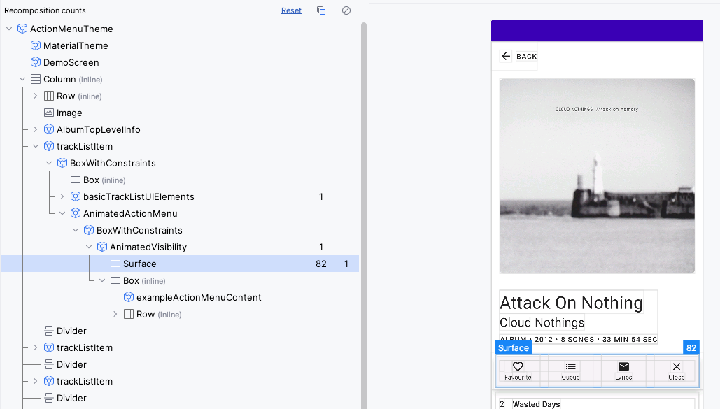Key points here are the number of recompositions on the Surface and the Box. The Surface has a expectedly high number which corresponds to the animation ticks of the left and right edge state values. The Box containing the menu escapes this high number of recompositions. It makes use of Modifier.drawWithContent which only affects the draw phase.