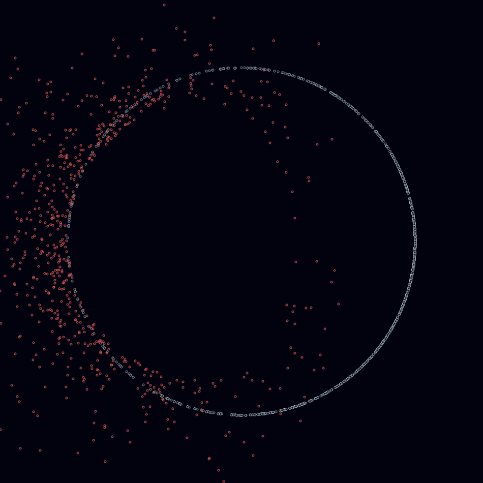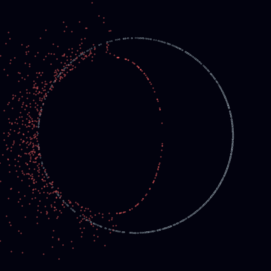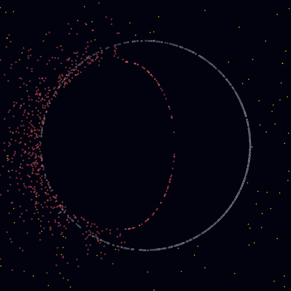 I used a similar strategy as the moon surface, I calculated points along a radius and used a Gaussian distribution to concentrate the points towards the left, the intended dark side of the moon.
