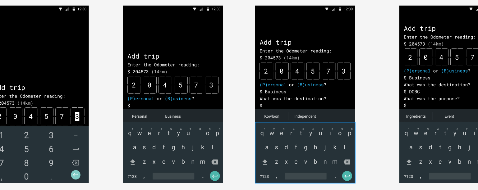 Only the last one or two digits will change for the majority of my trips so I wanted large tap targets that would make selecting individual digits easy. Once the digit is updated, selection moves to the next digit in the odometer value until it gets to the end so that I can smoothly type in the new sequence.